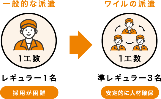 準レギュラーの活用による各地でレギュラーの確保が困難な状況が増えています。そこで週2~3日勤務の準レギュラーを採用し、シフト制によって必要工数の人数を確保します。