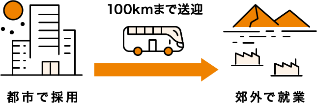 求人効果の少ない郊外は郊外の現場にはフリーター層の多い都市部で採用し、送迎により必要人数を安定供給します。都市部より約100km圏内は送迎可能です。